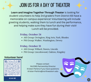 Learn and Imagine Together Through Theater is looking for student volunteers to help 3rd graders from District 65 have a memorable on-campus experience! Volunteering will include greeting students, walking them to lunch and the performance, and helping make sure they have fun during their visit!